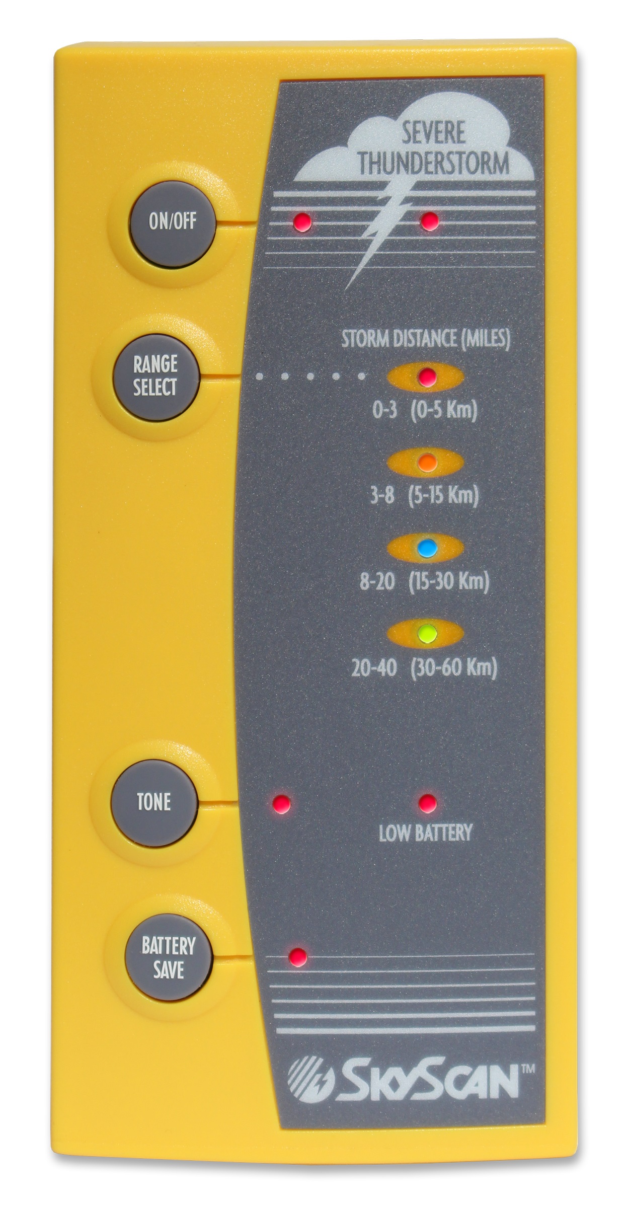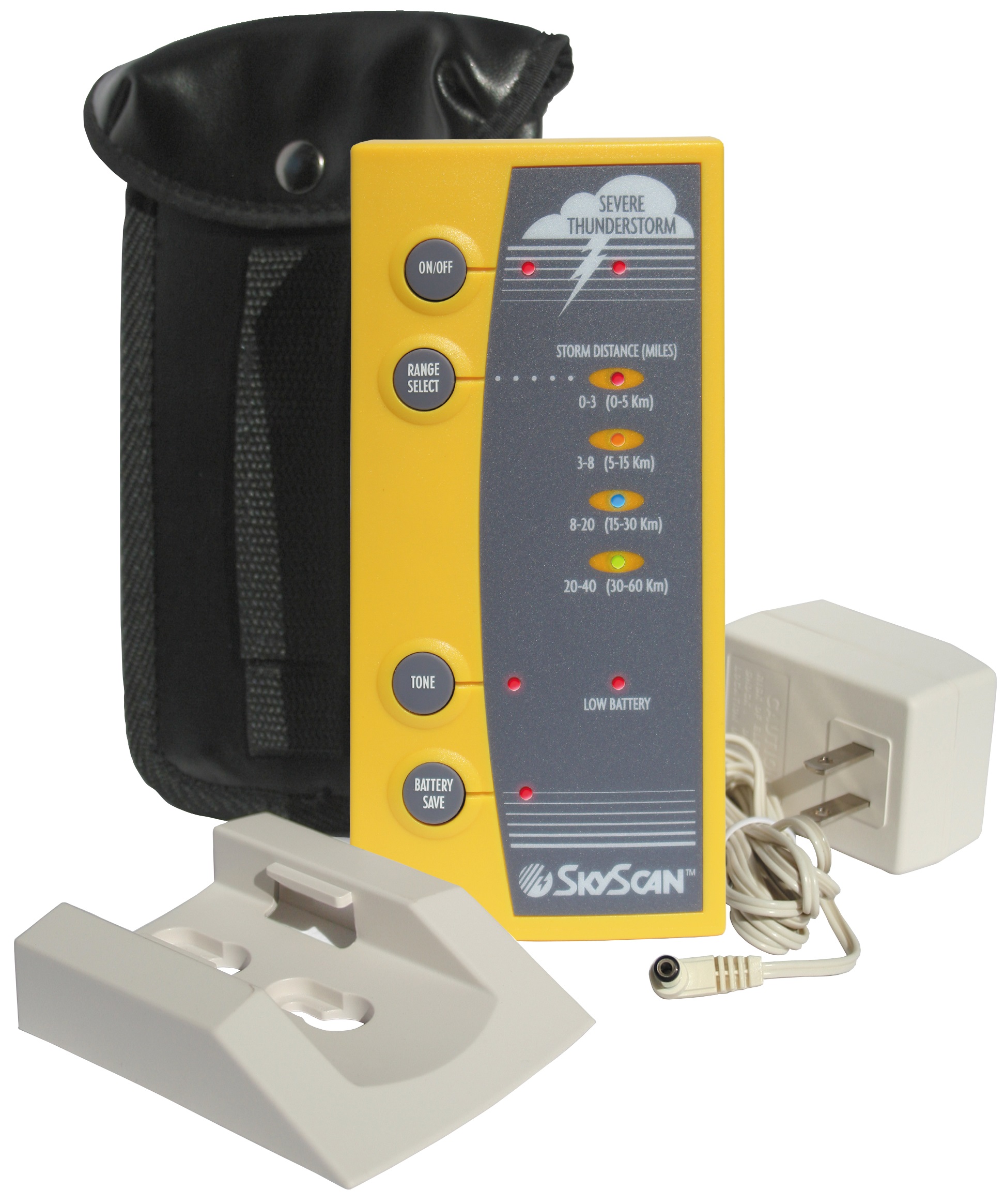 El detector portable SkyScan que le ofrece la capacidad de detectar la presencia de la actividad hasta 40 millas de su localización. SkyScan detecta las emisiones electromágneticas características de movimientos individuales del relámpago y utiliza tecnología patentada para determinar la distancia al movimiento detectado. Las distancias se indican en cuatro gamas: 0-3 millas; 3-8 millas; 8-20 millas; y 20-40 millas. Esto permite que usted siga el acercamiento de la actividad peligrosa de la tormenta. ¡Importante! SkyScan utiliza la informática electrónica y más última para proporcionar la información más exacta posible. Sin embargo, las tempestades de truenos son un fenómeno peligroso y rápidamente que cambia del tiempo. La información sobre la actividad de la tormenta obtenida de su SkyScan se debe utilizar siempre conjuntamente con la información de sus profesionales locales del tiempo. El sentido común y la precaución extrema deben ser utilizados siempre al enfrentar actividad del relámpago y de la tempestad de truenos.